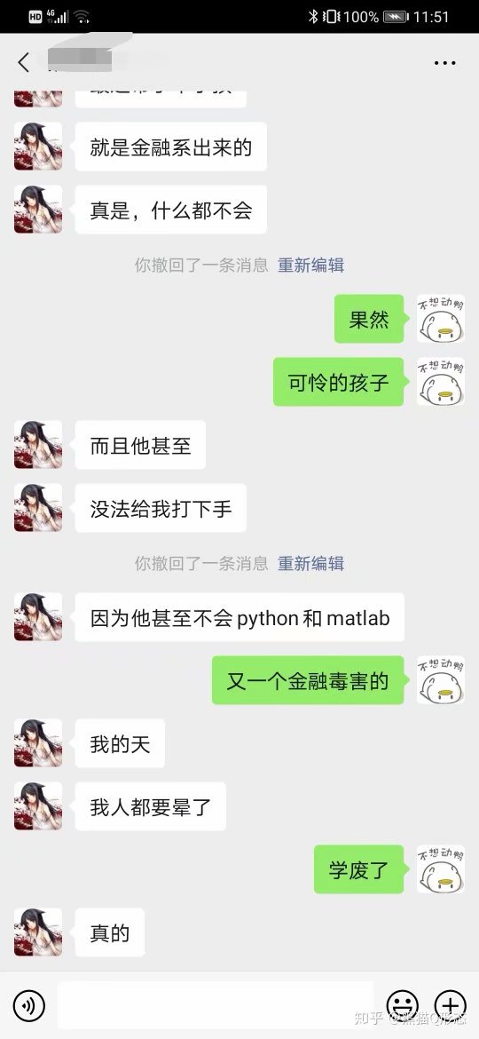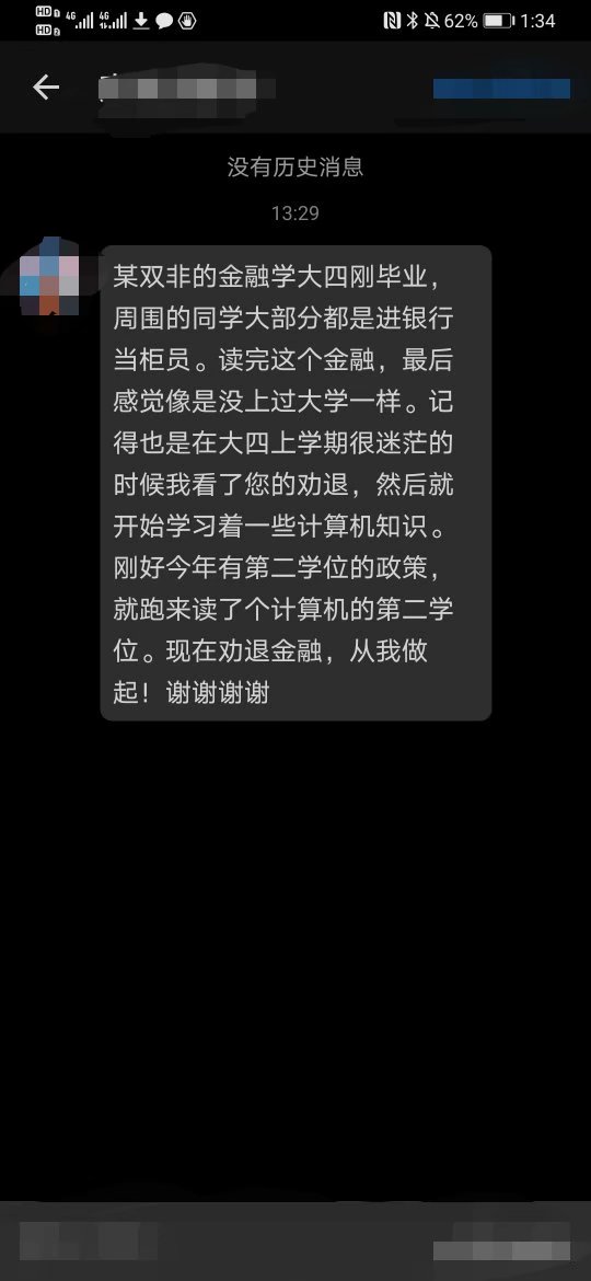 因此,我可以很明确的告诉各位,我之前说的大学金融专业是天坑等的言论,并非一时心血来潮的极端言论,而是我们目前面临的实际问题,你无法想象,一个已经毕业一年多的几个同学互相见面的时候,大家都还都是无业状态。甚至当年和我一起参加金融比赛的很多外校(多为211)同学,还有不就业的。