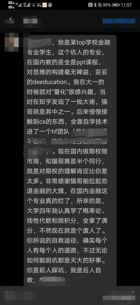 某985院校学生:金融的高等教育的核心就是高质量的实践机会,低的信息壁垒,校友的朋友圈,金融需要人才,但是大部分人只是去当金融民工的,但是不能因为着否定金融的高等教育,再总结一下重点,金融高等教育最重要的不在课程上。